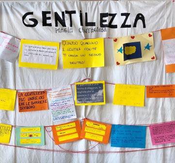 Nell’occasione è stato anche usato e appeso un lenzuolo bianco. Al centro capeggia la scritta di un alunno “Gentilezza Magia Contagiosa”, mentre ai lati sono state applicati bigliettini e pinzate molte altre frasi su questo importante tema, decorate con cordoncini di lana colorati.