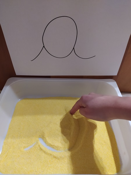 Modalità di gioco: ricopiare tracciando sulla sabbia la lettera scritta sul foglio