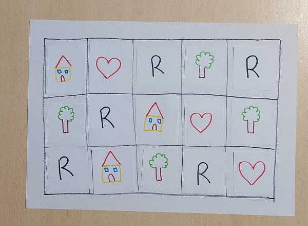 Modalità di gioco: lettura ad alta voce da sinistra a destra delle immagini (oggetti semplici e che il bambino conosce) e delle lettere (in stampato maiuscolo, minuscolo o corsivo) presenti nella griglia