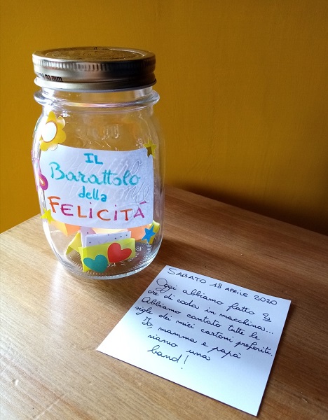 Modalità di gioco: ogni sera scrivete su un foglietto una cosa bella che avete vissuto durante la giornata con la data corrispondente, e mettetelo nel barattolo; quando il barattolo sarà pieno, apritelo e leggete i foglietti insieme alle persone care
