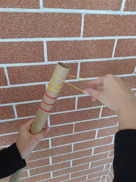 Modalità di gioco: infilare l’elastico nel tubo utilizzando una sola mano (si possono usare elastici piccoli con cui fare un solo giro o grandi che richiedono più giri)