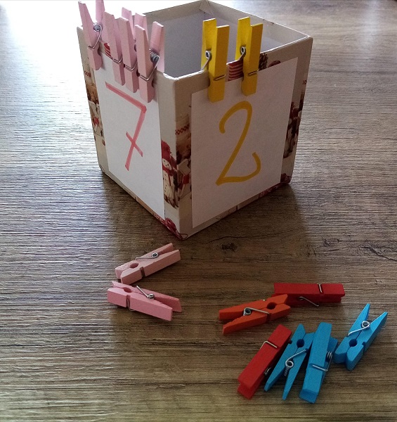 Materiali: scatola senza coperchio, fogli con numeri scritti, mollette colorate