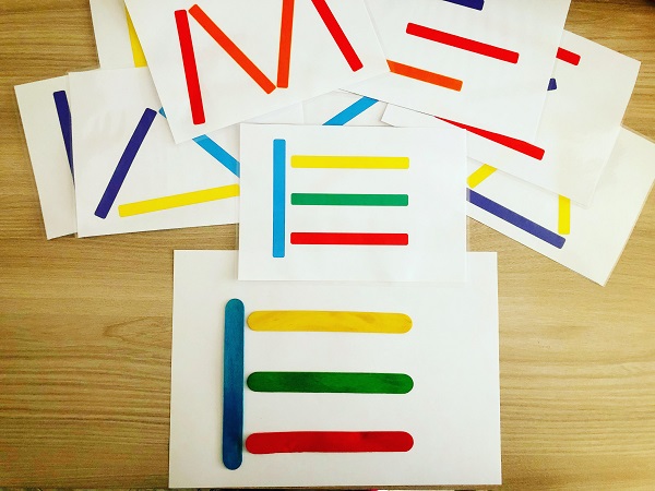 Modalità di gioco: con i pennarelli, disegnare dei modelli sul foglio di varia difficoltà e chiedere al bambino di riprodurli con i bastoncini