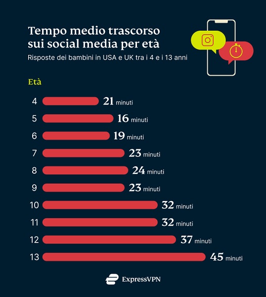 Per sensibilizzare i genitori e gli educatori su tali pericoli, ExpressVPN ha condotto un sondaggio che ha coinvolto 2000 bambini statunitensi e britannici tra i 4 e i 13 anni. Oltre a svelare la frequenza con cui i bambini visitano i social network, la ricerca evidenzia quali sono le minacce in cui i più piccoli possono incorrere a causa dell’uso delle piattaforme social.