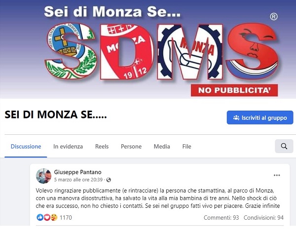 Il padre era visibilmente sotto shock e in quel momento non ha pensato a chiedere il nome al passante. Nella giornata di ieri ha quindi pubblicato un post nel gruppo Facebook “Sei di Monza se…” facendo un appello all’uomo che lo aveva aiutato per rintracciarlo e ringraziarlo per il salvataggio della figlia. “Cerco l’uomo che ha salvato mia figlia”, le parole del post del padre, che ha suscitato anche molti commenti positivi per l’azione del passante da parte di persone appartenenti al gruppo che hanno soprannominato il salvatore sconosciuto “l’angelo di passaggio”.
