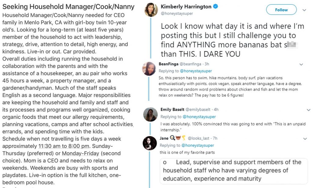 A rendere di pubblico dominio questa richiesta è stata la scrittrice Kimberly Harrington che ha twittato un estratto dell’annuncio, scatenando una valanga di commenti, alcuni dei quali indignati mentre altri ironici. Qualcuno infatti ha suggerito che all’annuncio scritto da questa mamma potrebbe rispondere solo Mary Poppins. Mentre una donna ha commentato : “Io sono il manager di casa. Sono una MAMMA ! ”