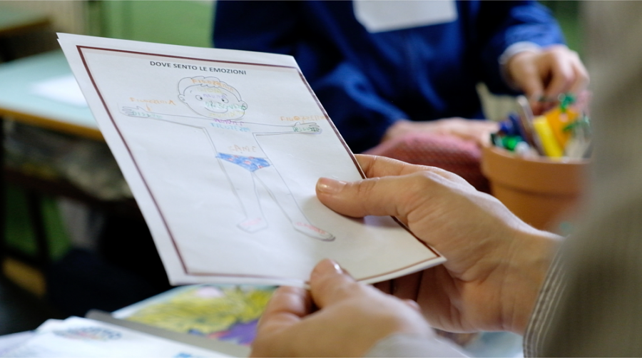 Nei tre incontri in ogni classe parliamo delle sensazioni fisiche di fame, sazietà e indigestione, esploriamo le emozioni e li stimoliamo a capire dove ognuno di noi, in maniera personale e magari diversa da altri, sente le emozioni nel proprio corpo.