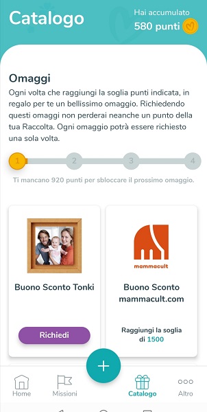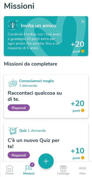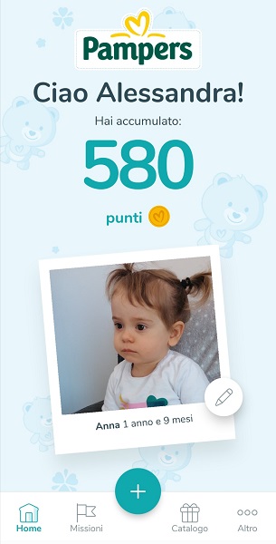 Oltre all’inserimento dei codici, grazie all’app si possono raccogliere punti partecipando alle missioni che vengono proposte ogni mese e comprendono la possibilità di invitare amici a scaricare l’app o la possibilità di rispondere a dei quiz che permettono anche di approfondire diversi temi riguardanti la cura dei nostri bimbi.