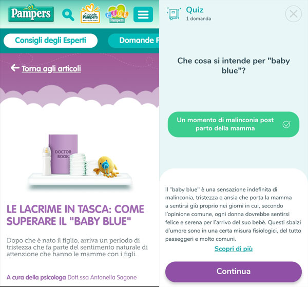 L’app, tramite il bottone “Scopri di più” mi collega al sito internet della Pampers dove si trovano articoli di approfondimento redatti da esperti in vari campi. È possibile anche rispondere a semplici domande personali nella sezione “Conosciamoci meglio” per accumulare ulteriori punti.