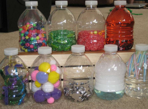 Materiali: bottiglie di plastica trasparenti, acqua, legumi, perline, pasta, sabbia colorata, riso, pon-pon, piume, foglie secche, bucce di arancia…