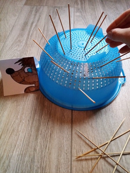 Modalità di gioco: infilare gli stecchini o le cannucce nei fori dello scolapasta, come per creare un riccio