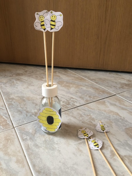 Materiali: bastoncini, fogli, matite, bottiglietta/profumatore per ambienti vuoto