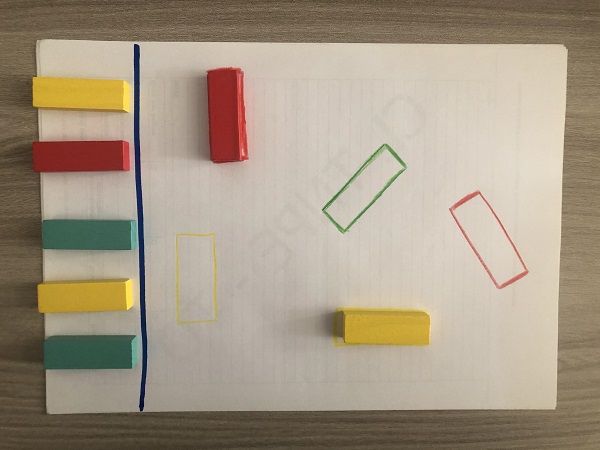 Modalità di gioco: disegnare le forme dei mattoncini e/o cubetti con diversi orientamenti e chiedere al bambino di collocare gli oggetti secondo la forma, il colore e l’orientamento