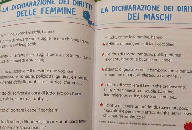 Quello dell’educazione di genere è oggi uno dei temi e degli argomenti più attuali della nostra società. Un post che ha fatto il giro del web negli ultimi giorni raffigura la pagina di un libro scolastico per bambini delle elementari in cui sono raffigurati alcuni fondamentali diritti che femmine e maschi hanno a disposizione, in maniera indipendente rispetto al loro sesso.