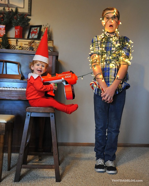 Alan Lawrence ha deciso di interpretare la storia in un modo veramente singolare: qualche anno fa, ha vestito il più piccolo dei figli da elfo, con un vestito realizzato a mano dalla mamma del piccolo, e gli ha scattato diverse foto in diversi punti della casa: utilizzando qualche fotoritocco, Alan ha “posizionato” il bambino sopra la doccia, nel frigorifero, a bordo di una piccola macchinina giocattolo, proprio come un vero elfo che entra nelle case in veste di aiutante di Babbo Natale e ne combina di tutti i colori.