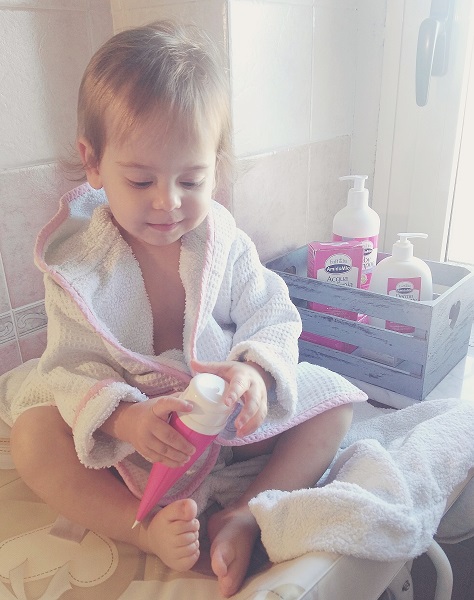 Il tocco finale della “beauty routine” di un bimbo non può che essere l’Acqua di Colonia. L’acqua di colonia di Amido Mio di Euphidra è una lozione delicatissima senza alcool e conservanti e Anna si diverte moltissimo ad annusarla. Il profumo è dolcissimo, lo uso anche io ogni tanto e, come dice il figlio di una mia cara amica, “sa di bambino”!