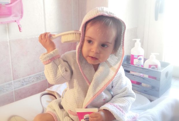 Anna ha compiuto da poco 16 mesi, ha iniziato il nido e ora cammina o meglio corre dappertutto! Il rito del bagnetto è un momento speciale che ci siamo sempre ritagliate alla sera, prima della nanna e per Anna è un modo per rilassarsi e giocare un po’ con la sua mamma.