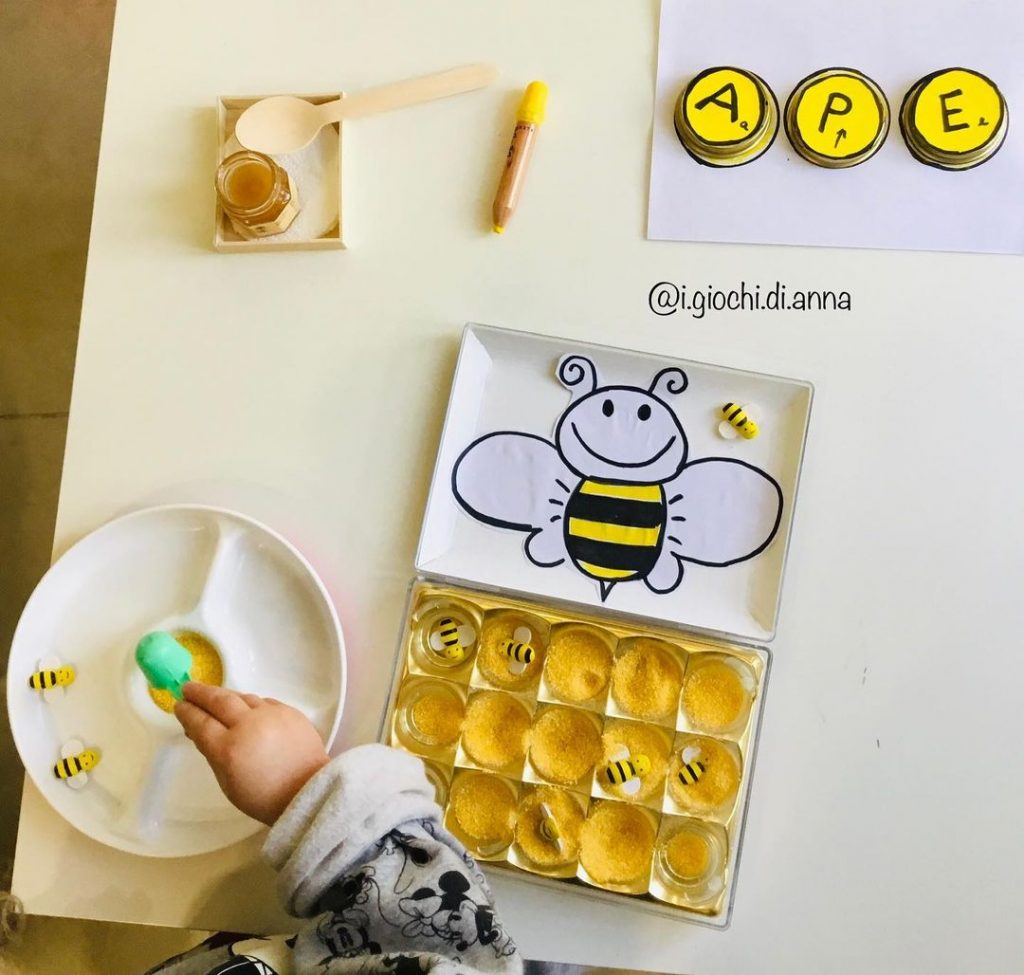 Una scatola di cioccolatini può diventare un delizioso alveare, aggiungendo della farina di mais e delle piccole api in legno invitiamo il bambino a travasare. Con i travasi aiutiamo i nostri pargoli a controllare i gesti e più gli oggetti da travasare saranno piccoli, maggiore sarà la destrezza e la concentrazione che svilupperanno.
