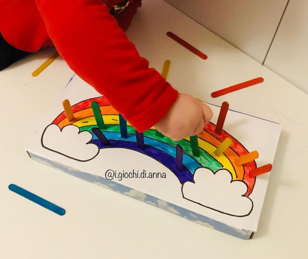 Attività facilmente realizzabile utilizzando un coperchio di una scatola di cartone, colori, taglierino e bastoncini colorati. Il gioco consiste nell’infilare i bastoncini nelle fessure del colore corrispondente sul disegno.
