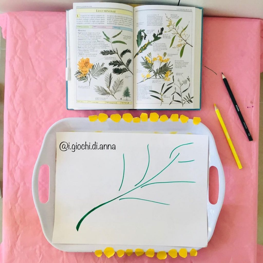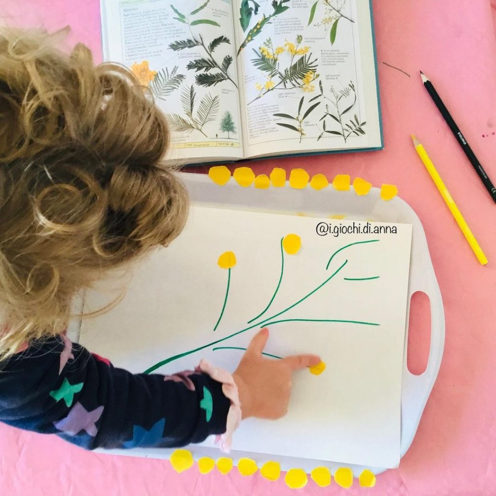 In questo caso abbiamo ricreato un ramoscello di mimosa utilizzando la tecnica del collage. Adesivi gialli in quantità e stimoliamo la creatività, miglioriamo la precisione dei movimenti, la motricità- fine e la coordinazione occhio-mano.