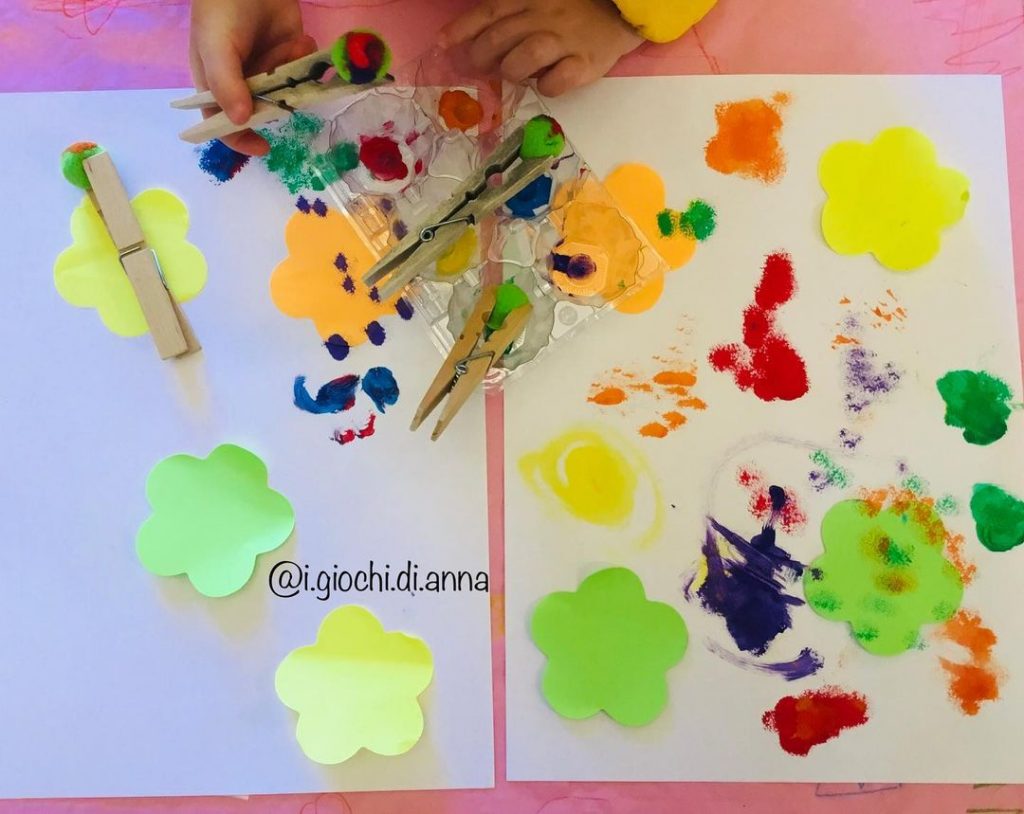 Mollette per stendere i panni e pon pon diventano un magico pennello dalla punta rotonda con il quale poter dipingere a pallini. In questo caso abbiamo realizzato un coloratissimo prato fiorito utilizzando dei post-it come guida.