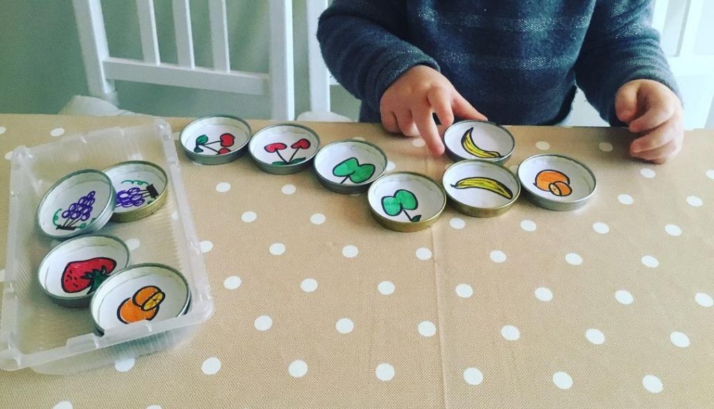 I tappi si prestano a tanti utilizzi per il riciclo creativo: in questo caso quelli degli omogeneizzati sono diventati un divertente memory, semplicemente attaccando al loro interno i disegni di vari frutti.