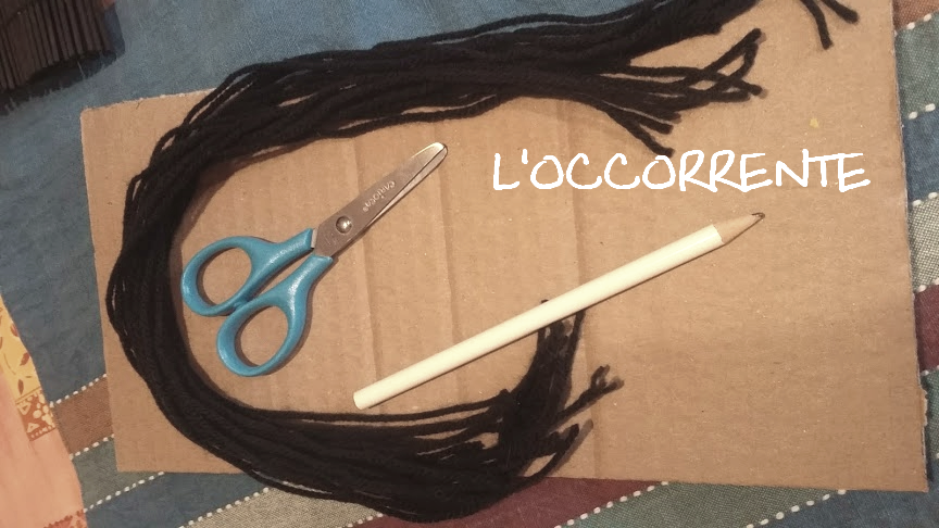 Poi scegliamo la lana e iniziamo a stabilire la lunghezza delle ciocche : noi abbiamo fatto circa 30 fili di lana lunghi 45 cm, ma ovviamente possiamo farli più lunghi. Il concetto è che dobbiamo rispettare un minimo le proporzioni viso/lunghezza delle ciocche.