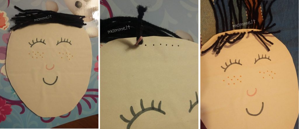 A questo punto rimane solo da fissare la chioma della nostra bambola : se volete maggiore libertà (ad esempio se volete cambiare lunghezza delle ciocche, scegliere un taglio asimmetrico), potete semplicemente annodare i fili tramite uno dei buchi che abbiamo fatto per la frangia. Io ho scelto questa opzione.