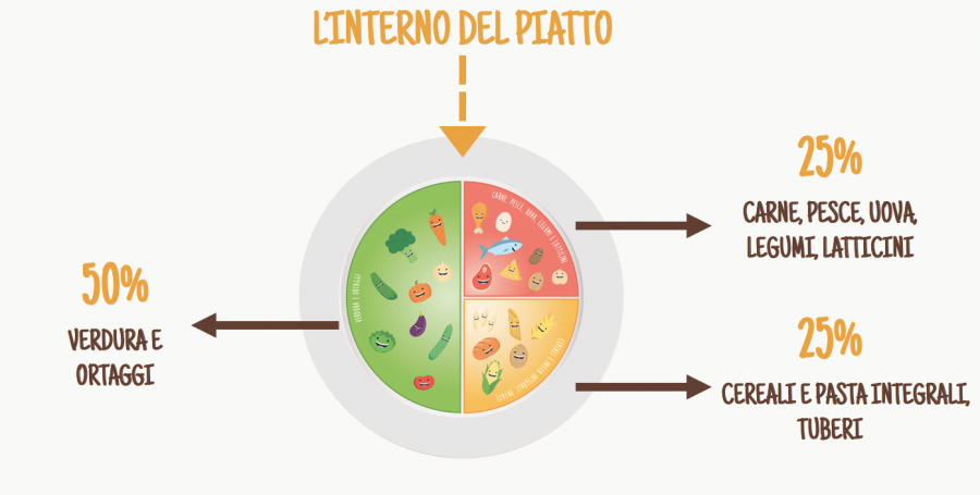 L’idea di base è la realizzazione di un piatto suddiviso nei tre grandi macronutrienti, che non devono mai mancare ad ogni pasto: verdure, proteine e carboidrati.