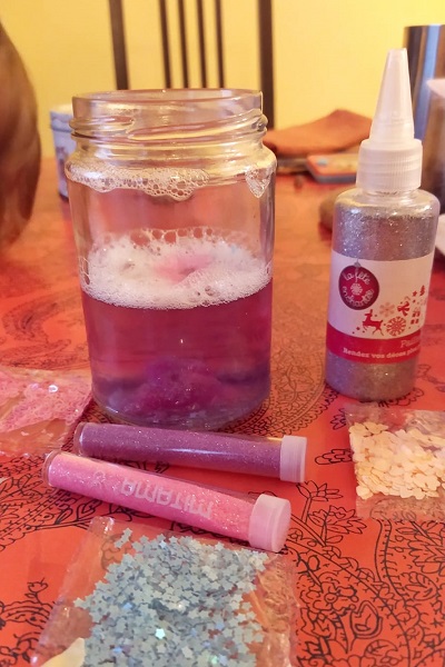 In pratica si tratta di una semplice bottiglia di plastica trasparente, o di un barattolo, contenente acqua e brillantini. Se vengono scossi si ottiene l’effetto delle classiche palle di neve, e i bambini restano letteralmente rapiti dall’osservare i brillantini che vagano nell’acqua e ricadono sul fondo.