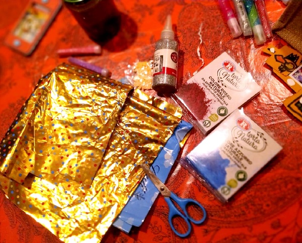 Potete anche inserire altri oggetti brillanti, possibilmente più leggeri dei glitter : noi ad esempio avevamo ancora un po’ di carta argentata dell‘uovo di Pasqua e lo abbiamo tagliato in tante piccole paillettes. Se sono più leggeri non andranno subito a fondo e daranno un bell’effetto ancora più rilassante.
