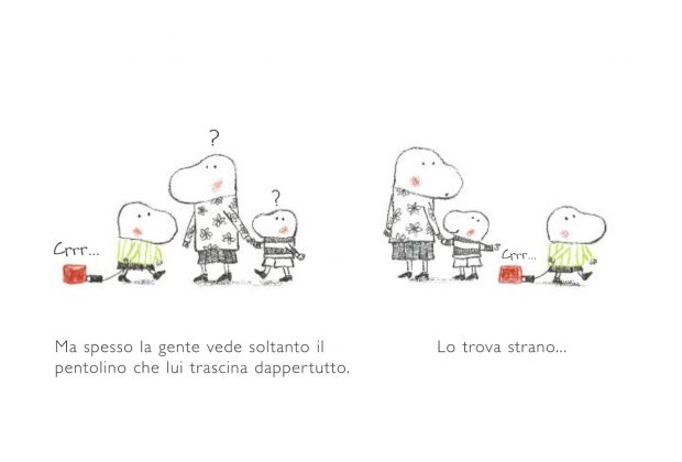 Quel pentolino potrebbe essere qualsiasi cosa: la perdita di una persona cara, una disabilità, un incidente, i genitori che si separano. Ogni cosa che un bambino può trovare difficile affrontare. Lui è imbarazzato da questo pentolino e spesso gli adulti non sanno come comportarsi. È un tale ingombro che Antonino rischia di sparire dentro il suo problema.