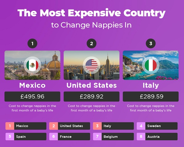 Il sito inglese Play Like Mum ha pubblicato la sua classifica, nella quale il nostro Paese occupa la terza posizione e nella quale il promo posto in assoluto è del Messico, mentre al secondo si trovano gli USA, con una spesa di poco maggiore rispetto all’Italia. Al contrario, in altri paesi come ad esempio il Giappone, il costo è molto più basso e si aggira intorno a 100 euro al mese, ma anche il Canada e la Polonia sono più economici con costi rispettivamente di 120 e 136 euro.