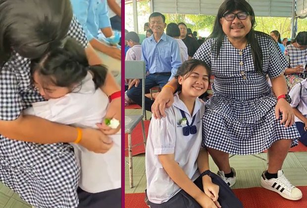 Il padre, il 48enne Joe Lookphonbodee, ha avuto un’idea per non lasciarla sola e l’ha messa in pratica, vestendosi da donna in modo da accompagnarla presso la scuola Ban Noen Kroi.