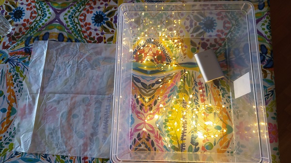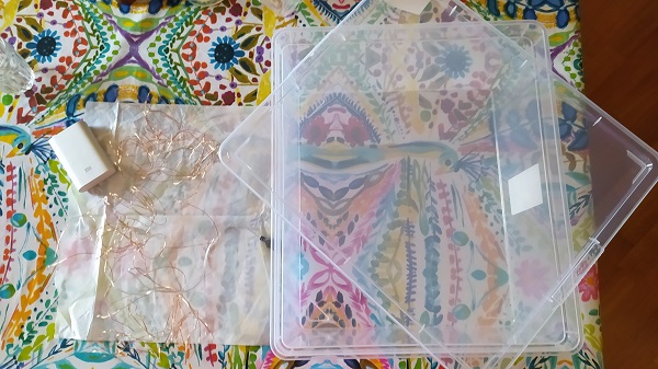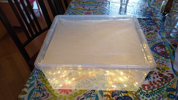 Adesso basterà attaccare il foglio bianco sotto al coperchio con dello scotch trasparente, inserire nella scatola la vostra catena luminosa accesa, chiudere il coperchio e voilà, il gioco è fatto !