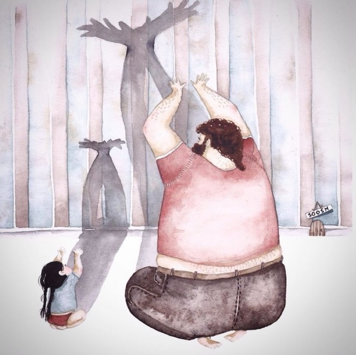 L’autrice di queste illustrazioni è una disegnatrice ucraina, che recentemente ha pubblicato su Instagram alcuni estratti dal suo libro “Stammi vicino, papà”. Nei suoi disegni appare un papà davvero imponente, affiancata alla figuretta minuta della bambina : sembra un po’ un gigante buono, protettivo e rassicurante, sempre pronto a giocare, coccolare e fare le trecce alla sua piccola.