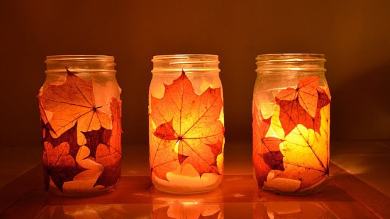 La seconda lanterna richiede forse un po’ meno manualità: occorre un barattolo in vetro, come quelli della marmellata, qualche foglia autunnale ingiallita, colla vinilica, pennello, rafia, un filo di ferro e un lumino.