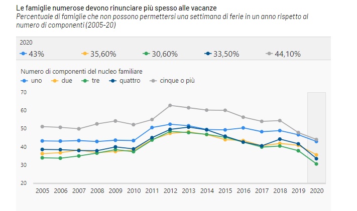 Da un’indagine condotta a livello europeo dall’Istituto EU/SILC – Statistics or Income and Living Conditions – emerge come in Italia le famiglie più numerose siano anche quelle che, per contenere le spese familiari, rinunciano alle vacanze.