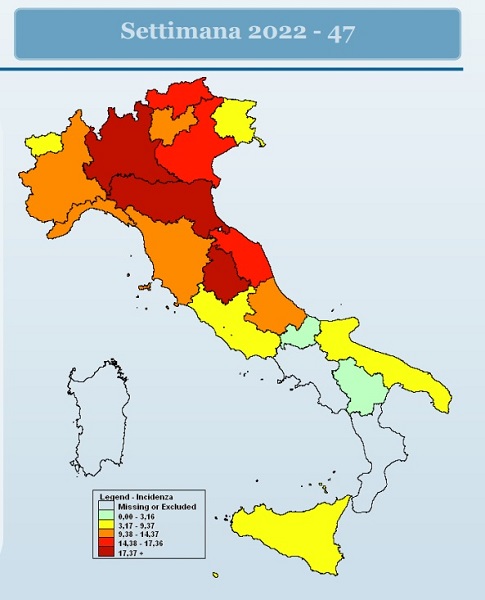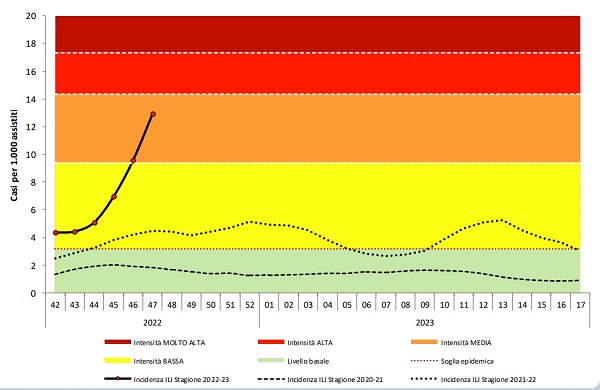 In particolare, nella 47° settimana del 2022, infatti, l’incidenza è pari a 12,9 casi per mille assistiti, registrando dunque un aumento rispetto ai 9,5 nella settimana precedente (21 al 27 novembre) e a 6,9 riportati nella settimana ancora precedente (14-20 novembre).
