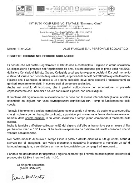 La dirigente Laura Barbirato ha spiegato con un’ordinanza le ragioni del suo provvedimento. La preside sostiene che nel regolamento dell’Istituto che è in vigore dal 2006, è vietato il digiuno durante l’orario scolastico. Le ragioni di questa scelta derivano dal fatto che per i bambini fino a 11 anni, l’osservanza del digiuno protratto per un mese è fisicamente molto difficile da sostenere. La dottrina islamica infatti prevede che alcune categorie di soggetti fragili siano esentati da questa prescrizione.