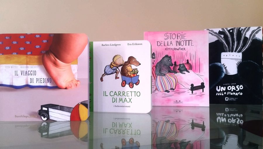 Seguono, per 18-36 mesi, Storie della notte, edito da Topipittori, scritto nel 2017, di Kitty Crowther, emotivo e esteticamente bellissimo, e Il Carretto di Maz, di Barbro Lindgren e Eva Eriksson, semplice, ironico e graficamente accattivante.