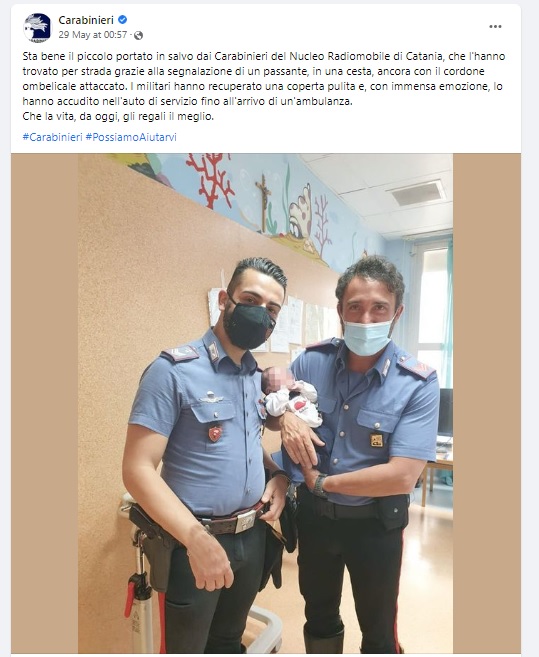 È stata una passante a segnalare la presenza di una cesta in un cassonetto di via Rametta a Catania. La donna ha sentito dei vagiti e ha subito notato una cesta da cui spuntava una piccola manina. L’immediato allarme lanciato dalla signora ha permesso ai carabinieri del nucleo radiomobile di intervenire prontamente e mettere in salvo il neonato.