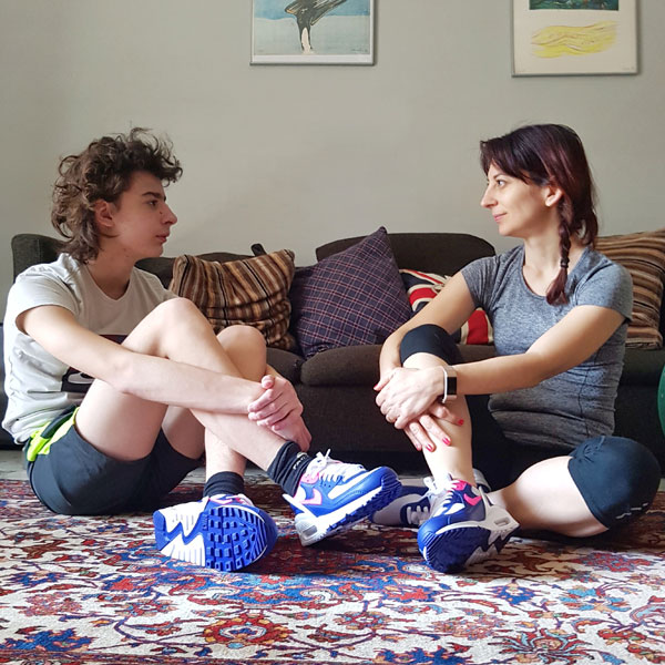 Niente di complicato visto la forbice di età compresa dagli 8 ai 15 anni, il nostro allenamento comprende brevi sessioni miste tra yoga, pilates e altri esercizi a corpo libero. In più, le due ginnaste si prodigano in posizioni ed esercizi che io e l’adolescente non potremmo nemmeno sognare di fare.