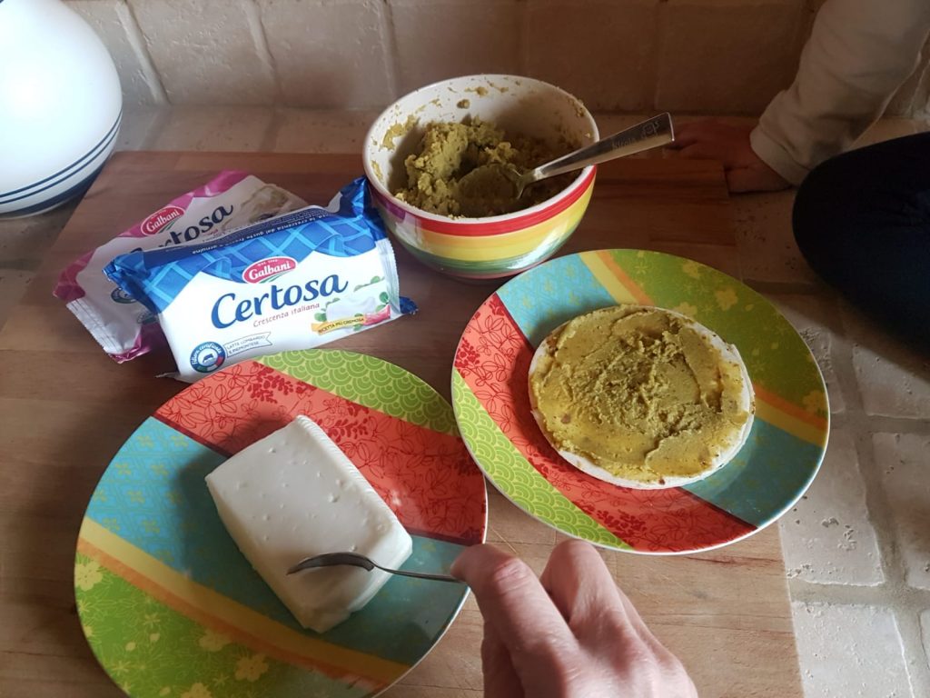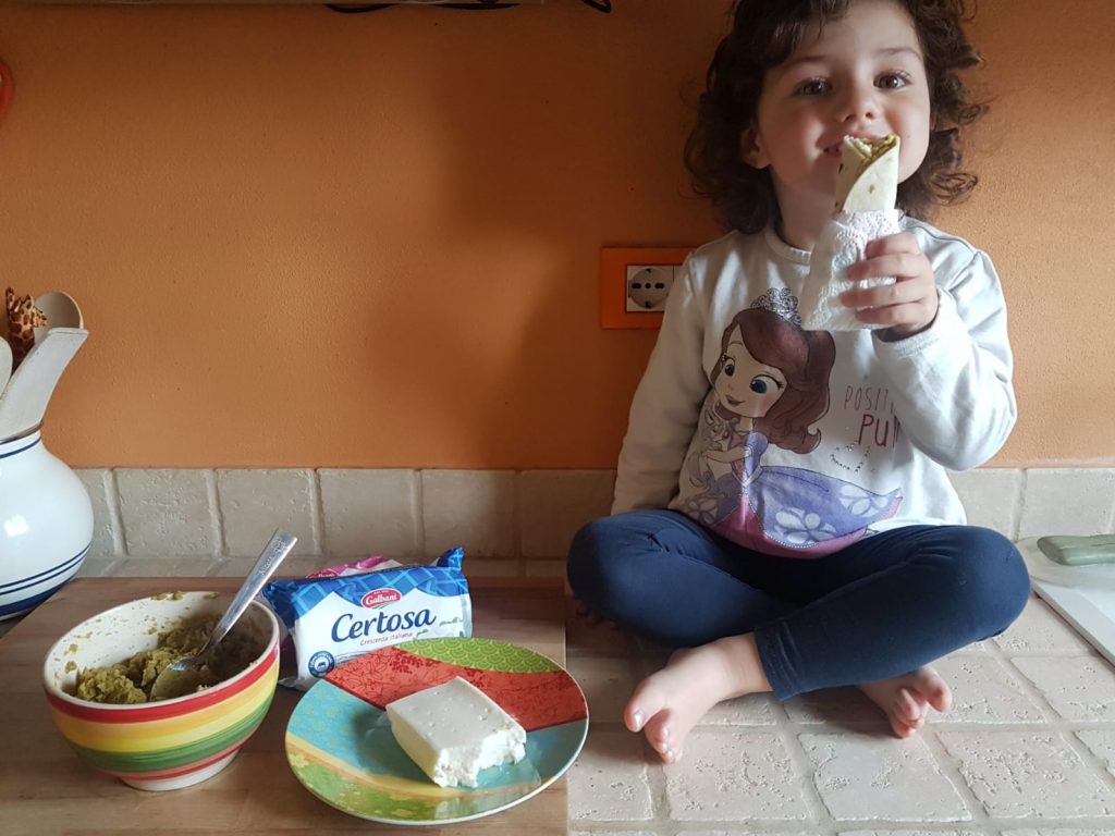 Piadina con Certosa e crema di patate e spinaci (qui è la piadina “di Hulk” o “di dinosauro”)