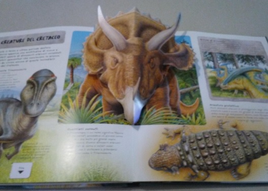 Accanto a testi sempre interessanti e mai banali, ci sono poi ottime riproduzioni grafiche e molte pop-up, come piacciano tanto ai bambini. Così si sfoglia, una pagina dietro l’altra e si incontrano i dinosauri del Mesozoico, si gira una rotella e la terra cambia forma, si tira un cartoncino e si scopre come un animale è diventato un fossile. Non possono ovviamente mancare l’amatissimo Triceratopo e il T-rex, anch’essi pop up, che protendono le corna o stanno a bocca per mostrarci i loro strepitosi denti.