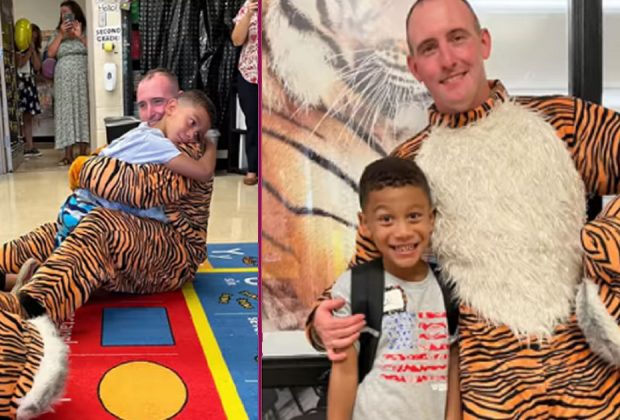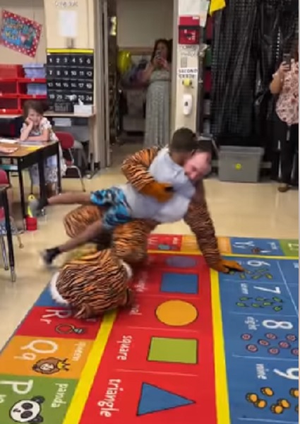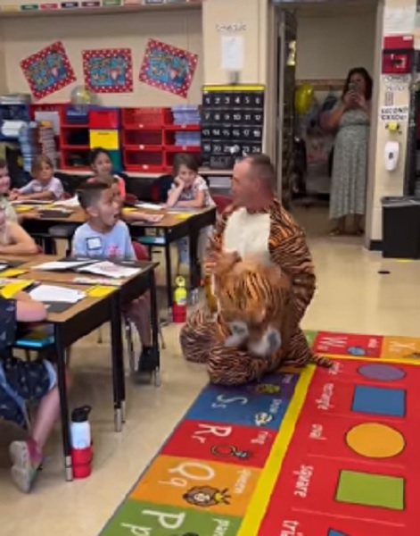 Proprio in quel momento ha bussato alla porta della classe un uomo travestito da tigre (che è anche la mascotte della scuola), con enorme stupore di tutti i piccoli studenti. Quando poi l’uomo si è fatto riconoscere, Eli gli è saltato al collo gridando e piangendo per la sorpresa: sotto la maschera c’era suo papà!