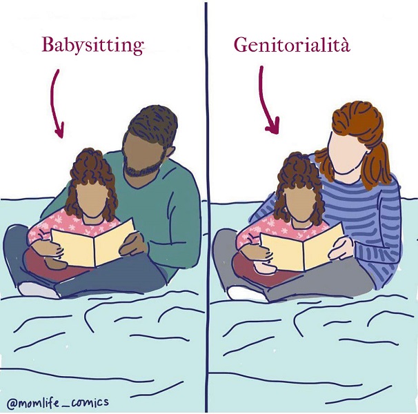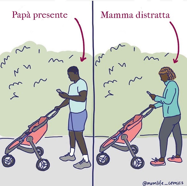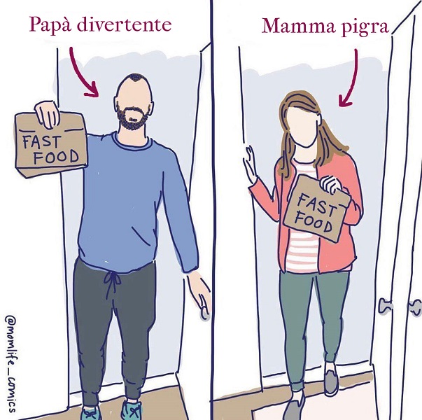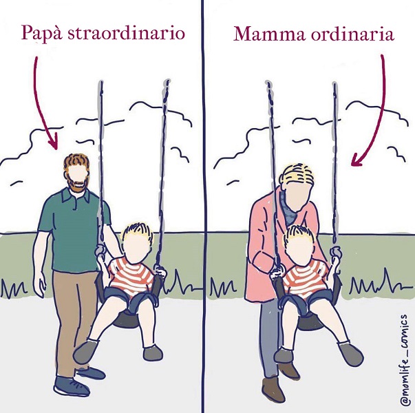 Ancora, se il papà legge una fiaba al figlio, si tratta di un padre che sta “guardando i bambini”, che li intrattiene mentre la mamma è impegnata. Se lo fa la madre invece, essa sta solo adempiendo al suo ruolo di madre: chi altro dovrebbe farlo?