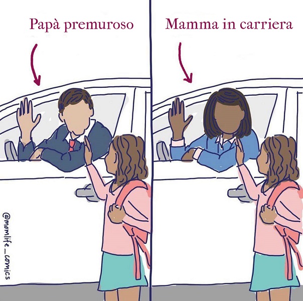 Un papà che prima di andare a lavoro, saluta i figli affettuosamente, è classificato come attento e premuroso, ma se è la madre a lavorare, allora l’attenzione automaticamente si concentrerà solo sul suo ruolo di lavoratrice.