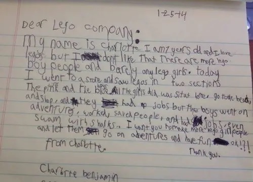 Nel 2014 è uscita la storia di una bambina di 7 anni (Charlotte Benjamin) appassionata dei mattoncini Lego. Nelle sue parole trasmetteva tutto il suo disappunto nei confronti all’azienda, dichiarando di aver notato una sorta di sessismo nei set per bambine. Qui, scriveva la piccola “le donne rimangono sempre sedute in casa, in spiaggia, oppure a fare shopping nei negozi, e non hanno un lavoro, mentre i maschi vanno all’avventura, al lavoro, riescono a salvare la gente e nuotano persino con gli squali“.