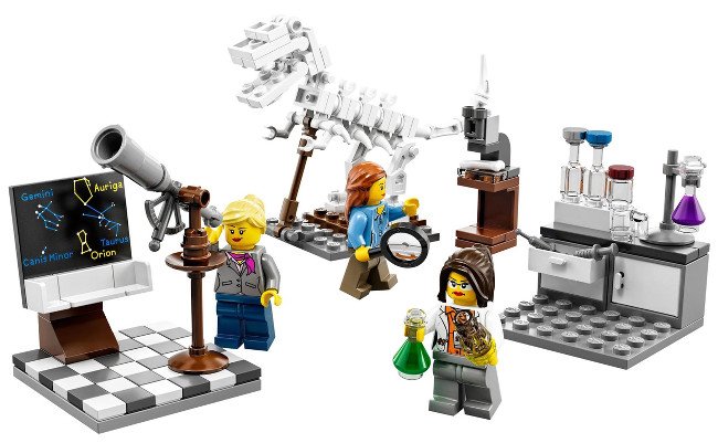 Si è passati ai fatti con la realizzazione di “Research Institute“, un set con un laboratorio scientifico con tre scienziate ed un’infinità di accessori molto dettagliati. Troviamo l’astrofisica con il suo telescopio e la lavagna (con le costellazioni), la chimica con becher, provette e microscopio, mentre la paleontologa ha uno scheletro di T-Rex e l’immancabile lente d’ingrandimento.